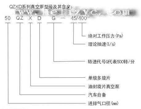 下面舉個(gè)例子說(shuō)明專(zhuān)用真空泵的型號所表示的含義,,威龍真空泵的型號為50QZXDG-45/400,其中50表示進(jìn)排氣口徑(mm),QZ表示汽車(chē)自備,X表示油封旋片真空泵,D代表單級多旋片,G是轉速代號(G代表500轉/分),45表示理論抽速(l/s),400代表絕對工作壓力(Pa)。